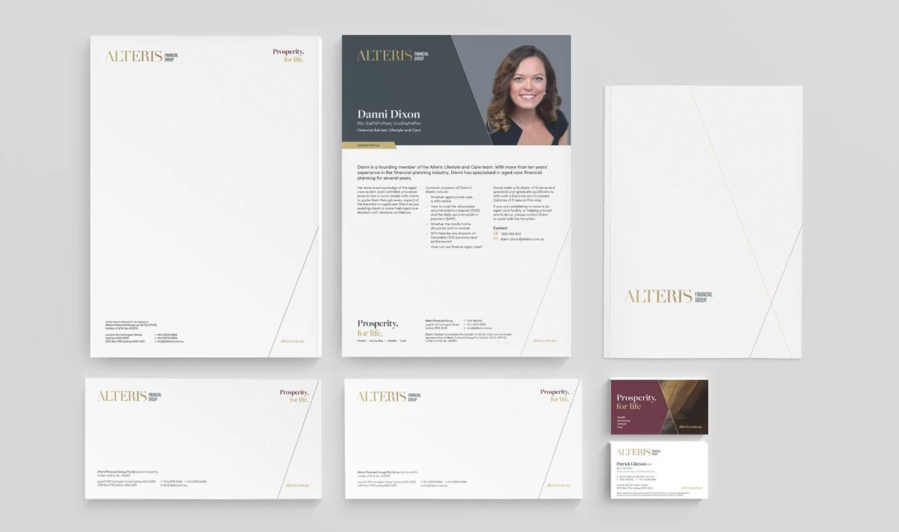 Development of comprehensive brand guidelines for its corporate brand along with its top tier investor brand, Alteris Private, and its community brand, Alteris Women, were developed including associated templates, print collateral and bespoke office signage.